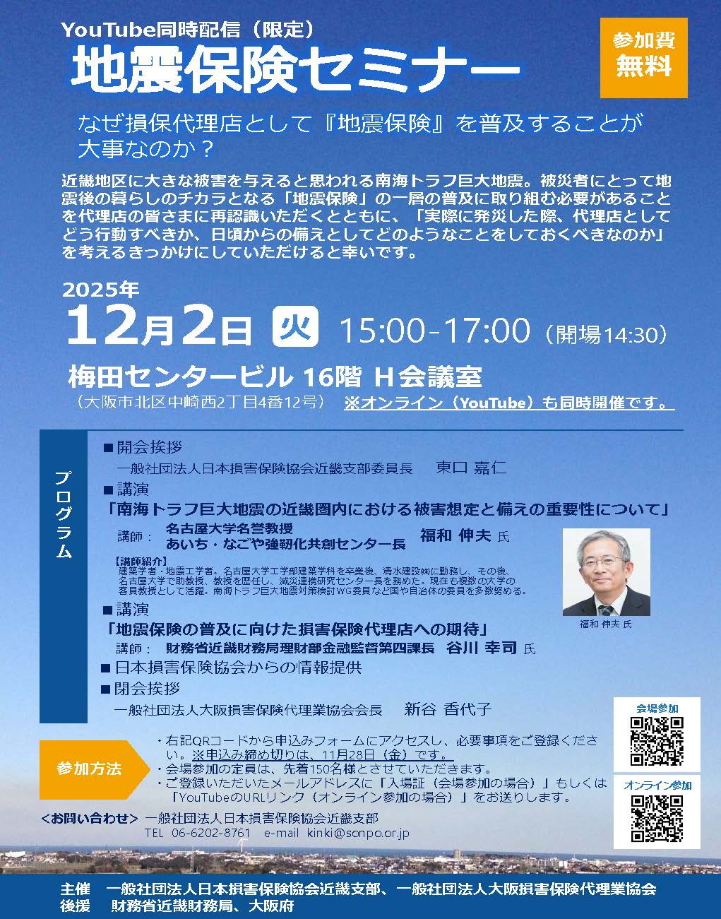 今般、当支部における地震保険普及のための取組みとして、「地震保険セミナー」を開催いたします。