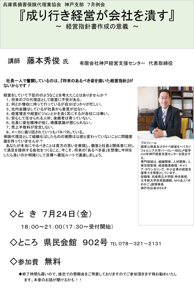 兵庫県損害保険代理業協会 神戸支部 7月例会のお知らせです。