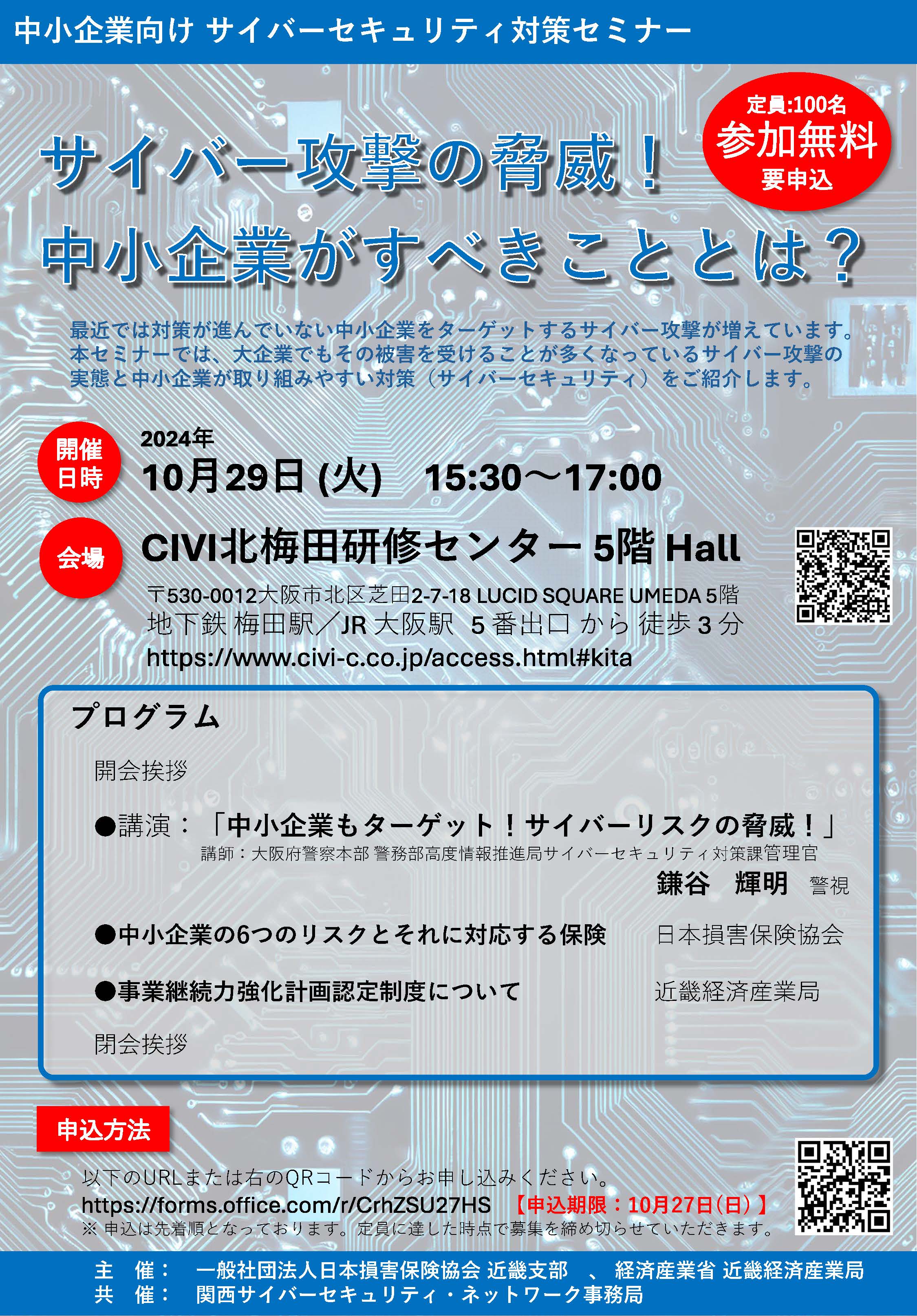 損保協会近畿支部では、今般、下記のとおり、中小企業を対象としたサイバーセキュリティ対策セミナーを近畿経済産業局・大阪府警察の協力のもと開催することとなりました。