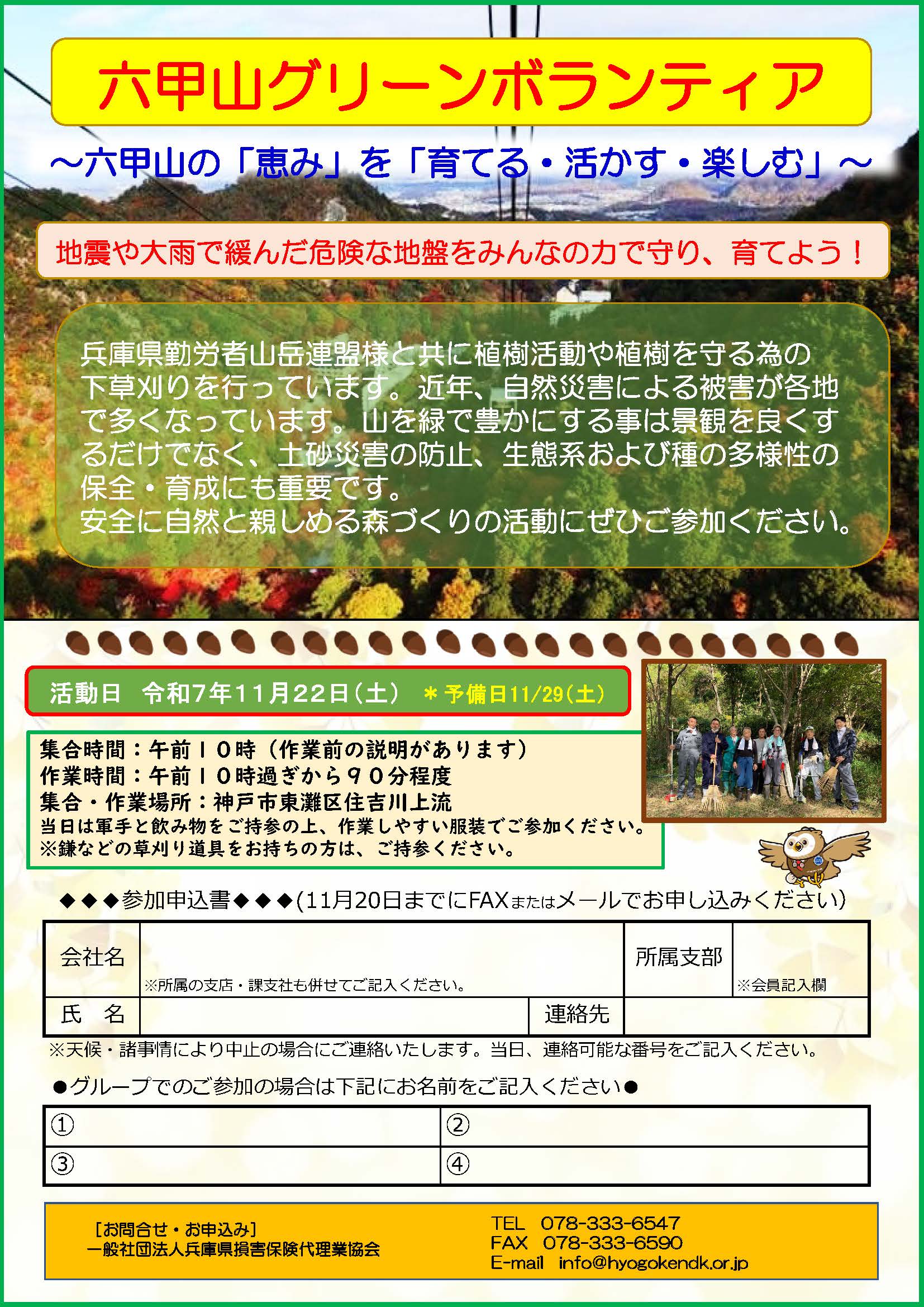 兵庫県勤労者山岳連盟様と共に植樹活動や植樹を守る為の下草刈りを行っています。近年、自然災害による被害が各地で多くなっています。山を緑で豊かにする事は景観を良くするだけでなく、土砂災害の防止、生態系および種の多様性の保全・育成にも重要です。